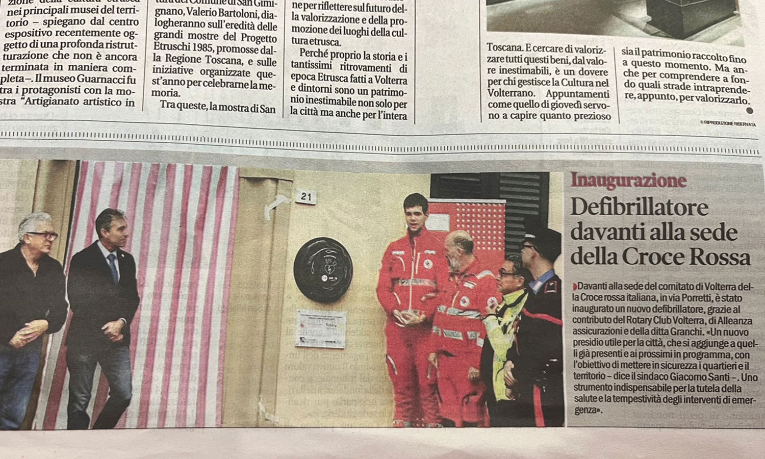 Davanti alla sede del comitato di Volterra della Croce Rossa Italiana, in Via Porretti, è stato inaugurato un nuovo defibrillatore, grazie al contributo del Rotary Club Volterra, di Alleanza assicurazioni e della ditta Granchi.